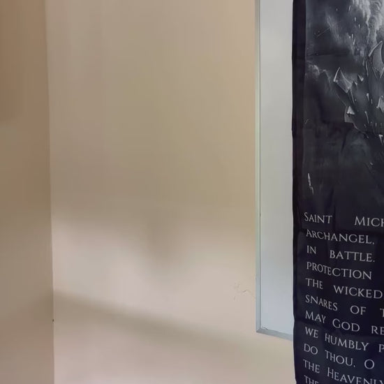 Elevate your space with the Saint Michael Archangel Flag by @DimensionalStory, a bold large black wall tapestry designed for rooms or studios of those taking their spiritual warfare seriously, featuring an epic image of Saint Michael the Archangel in battle, wielding his sword against darkness, alongside the full Prayer to Saint Michael the Archangel, crafted from durable, high-quality fabric, this Christian decor piece serves as a powerful reminder of the heavenly army you’re part of and the archangel who, by the power of God, expelled the devil from heaven, inviting you to ask for his assistance, join us now on this modern crusade we’re at!
